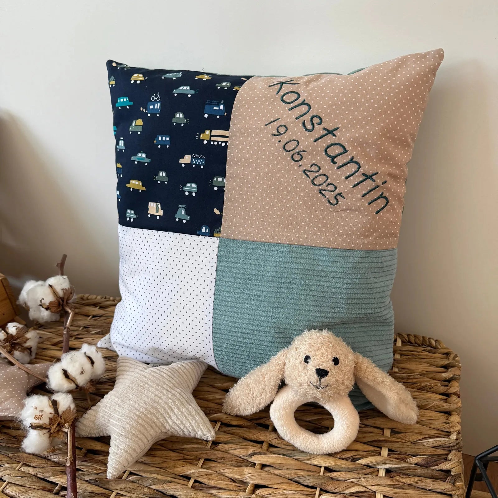Ein besonderes Highlight unserer Patchworkkissen ist die Personalisierung. Du hast die Möglichkeit, den Namen des Babys oder des Täuflings auf das Kissen besticken zu lassen und ihm so eine ganz individuelle Note zu verleihen. Dadurch wird unser Patchworkkissen zu einem persönlichen und einzigartigen Geschenk zur Geburt, zum Geburtstag oder zur Taufe.