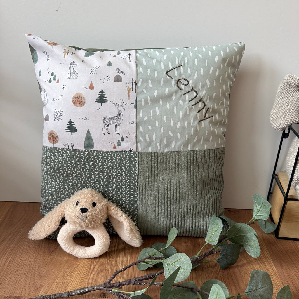 Ein besonderes Highlight unserer Patchworkkissen ist die Personalisierung. Du kannst den Namen des Babys oder des Täuflings auf das Kissen besticken lassen und ihm so eine ganz individuelle Note verleihen. Das macht unsere Patchworkkissen zu einem persönlichen und einzigartigen Geschenk zur Geburt, dem Geburtstag oder Taufe.