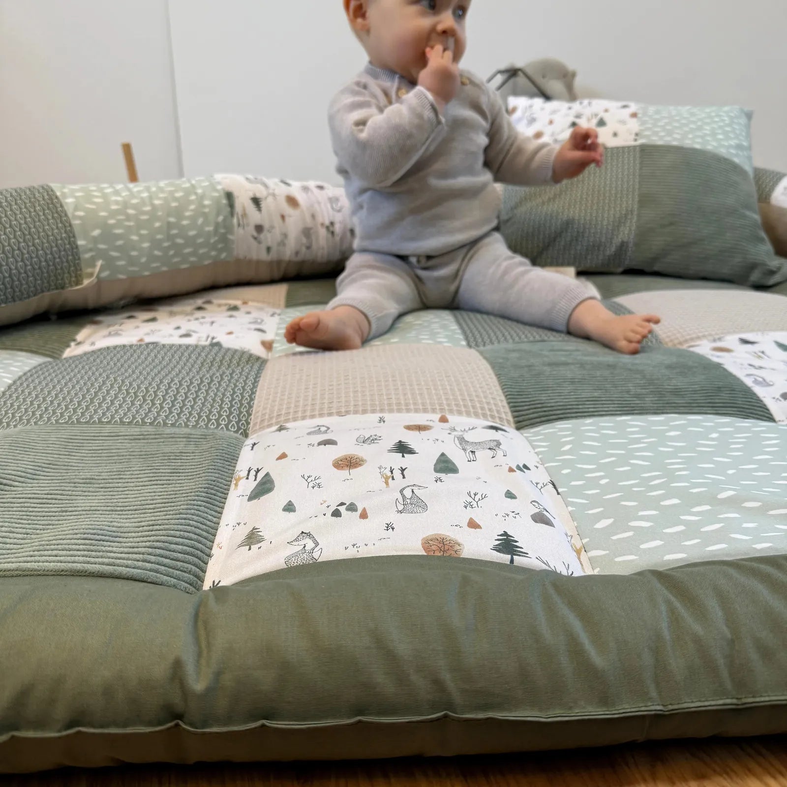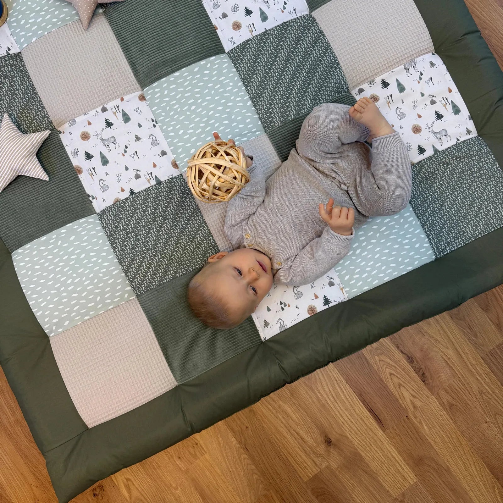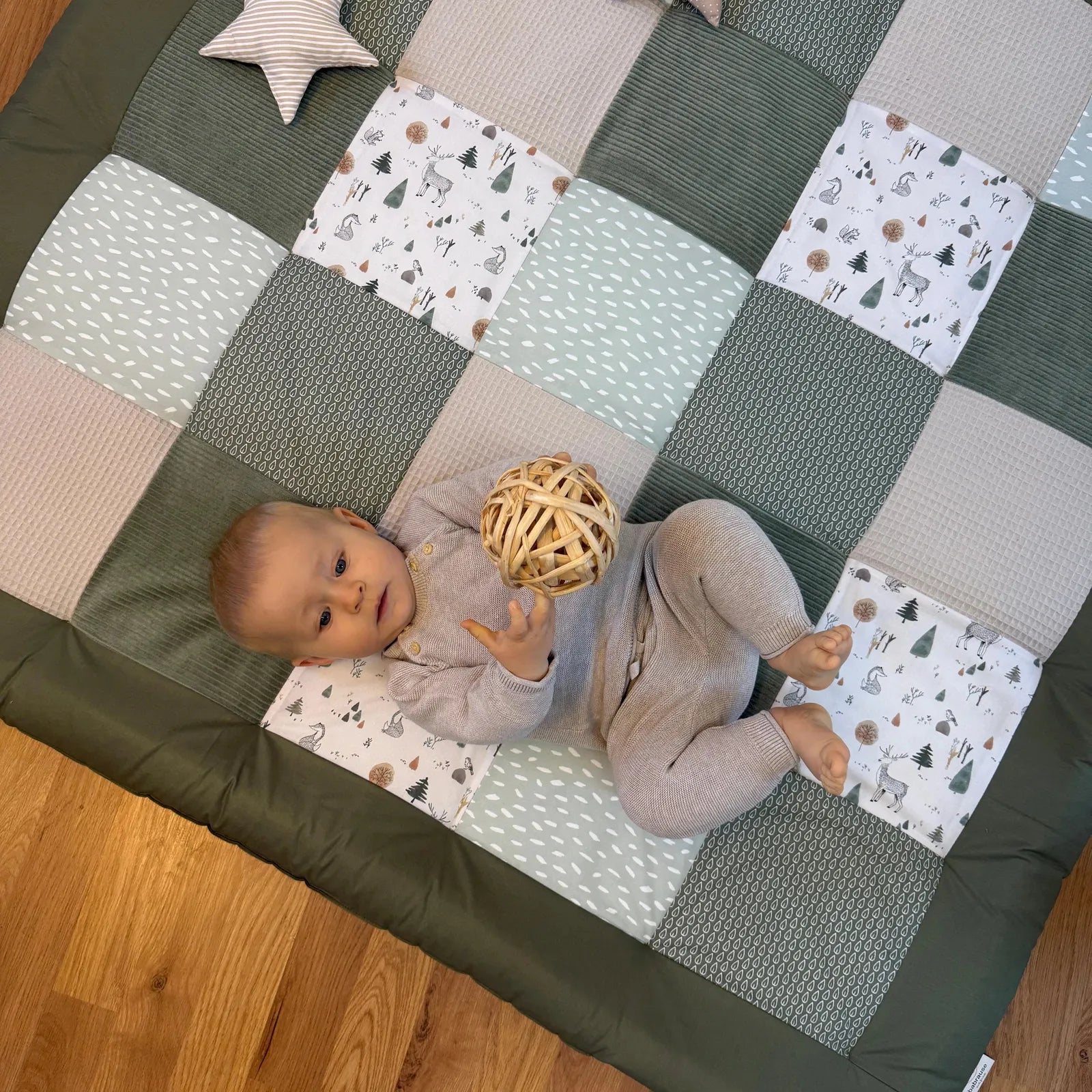 Dein Baby hat viel Platz zum Krabbeln, Spielen und Entdecken. Unsere Patchwork Krabbeldecke eignet sich auch perfekt als Laufstalleinlage oder Spieldecke im Kinderzimmer. Die bunten Farben und Muster stimulieren die Sinne und deines Kindes und bringen Farbe in euren Alltag. Dank des strapazierfähigen Baumwollstoffs ist die Krabbeldecke ein robuster Begleiter in der Babyzeit.