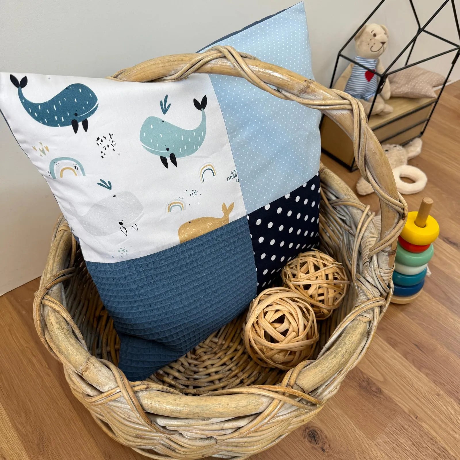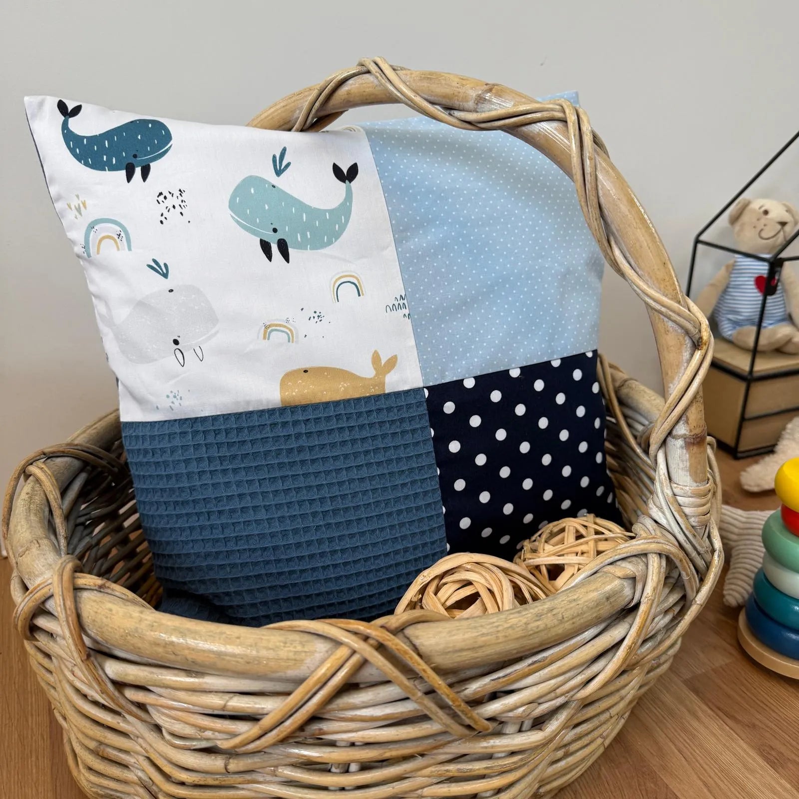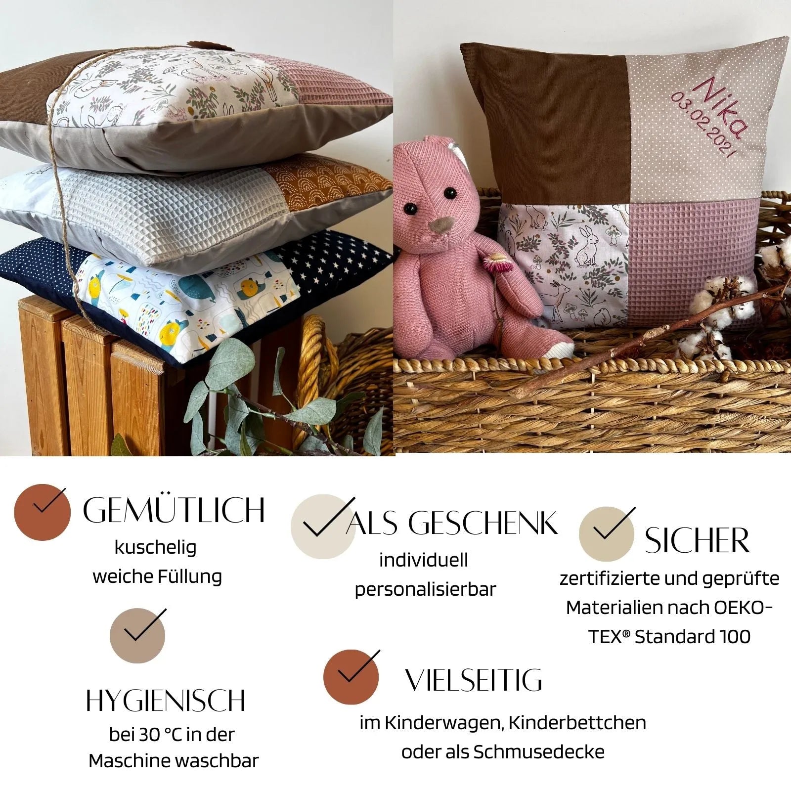 Das Kinder-Kissen im Patchworkdesign zum Anlehnen. Das perfekte Geschenk zur Geburt oder Taufe und ein echter Hingucker im Kinderzimmer.